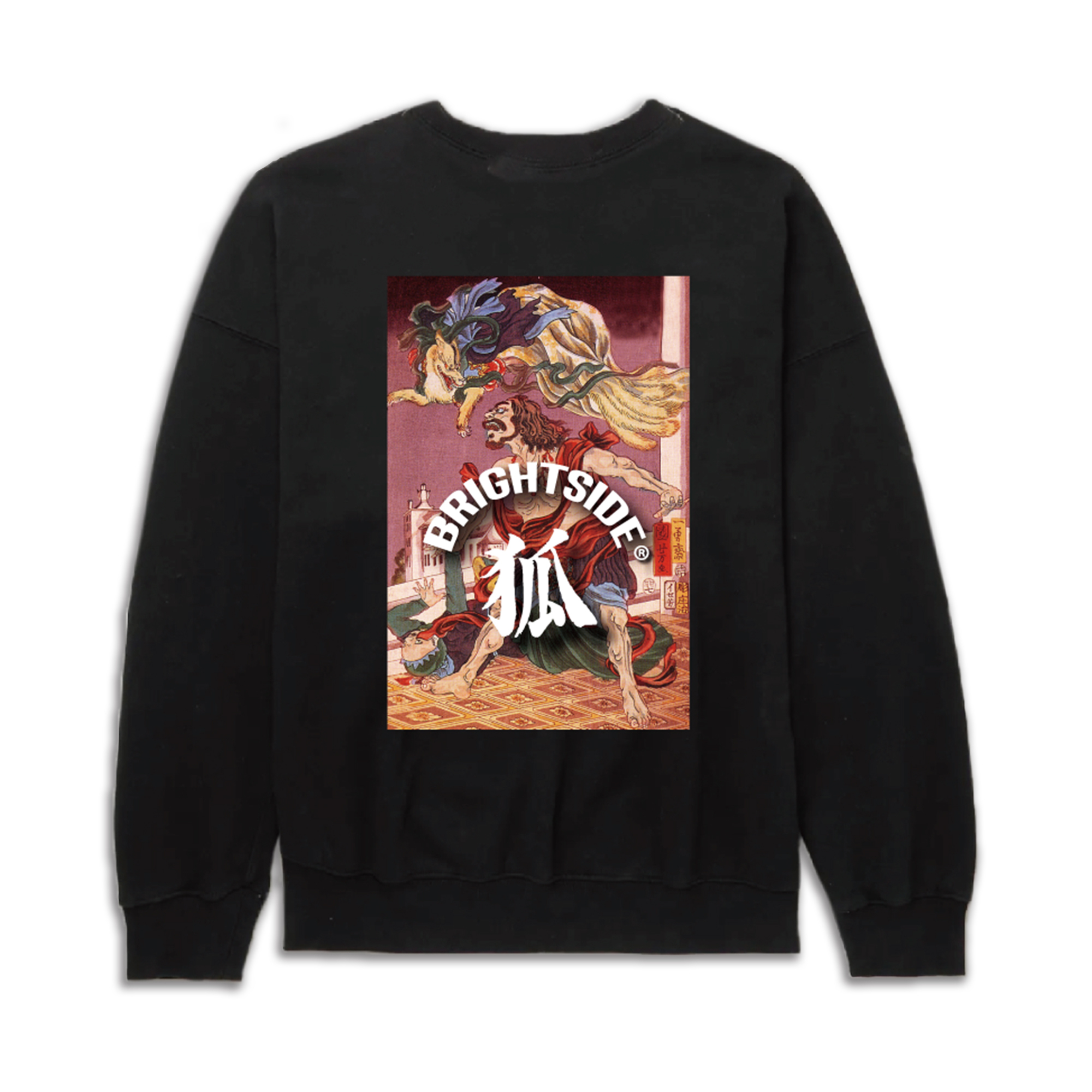 Brightside ® 九尾妖狐大學T設計引用"歌川國芳"的浮世繪—"班足太子與九尾狐",傳說中白面金毛九尾狐發源於印度,最早以南天竺摩揭陀班足太子之妃華陽夫人的身份出現,打算毀滅南天竺假傳神諭,讓班足太子斬千首以祭祀大黑天,卻被仙草點出原型,落荒而逃。